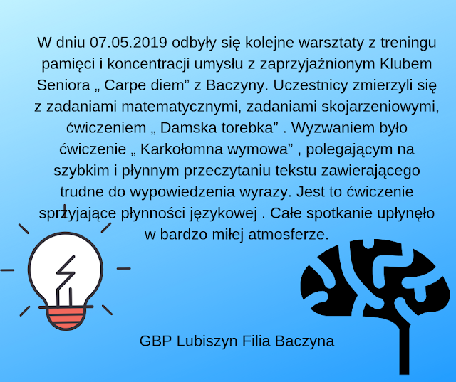 W dniu 20.09.2019 Gminna Biblioteka Publiczna w Lubiszynie z filią w Baczynie wraz z Klubem Seniora „Carpe diem” z Baczyny wspólnie przyłączyły się do ogólnopolskiej akcji Narodowe Czytanie 2019. Przeczytano Nowele polskie „Katarynka” Bolesława Prusa, „Dym” Marii Konopnickiej oraz „Dobra Pani” Elizy Orzeszkowej. W spotkaniu uczestniczyła również młodzież, która aktywnie włączyła się w akcję narodowego czytania. Dziś teksty te nic nie straciły na swojej aktualności , uczą nas wrażliwości na ludzką krzywdę. Spotkanie zostało zakończone plebiscytem na najpiękniejszą nowelę oraz słodkim poczęstunkiem.